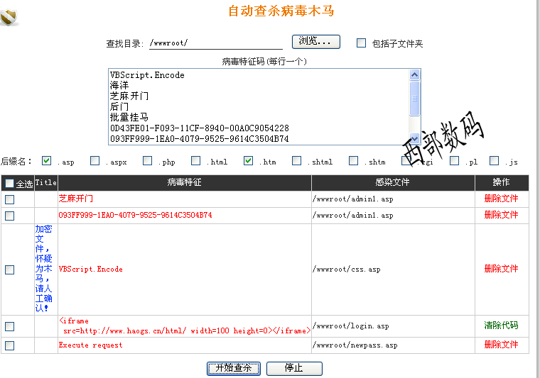 因传统杀毒软件不能有效地识别网页木马,特别是网页木马经常被加壳或制作为变种!所以我司自主开发了专门针对网页木马的杀毒软件,每天晚上自动扫描所有网站。发现木马的,对该文件自动更名;发现iframe病毒的,对病毒代码自动清除;并自动通过电子邮件通知你,让您轻松掌握您的网站情况