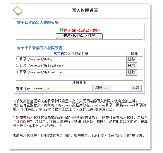 通常用户网站被黑(如网页被篡改,文件被盗,被删等)都是因为黑客通过网站的文件上传功能将asp/php木马上传到空间并运行造成的。 所以在无法确认系统是否存在上传漏洞的情况下,只要保证文件上传目录没有脚本运行权限,那么即便黑客将木马上传到您的空间他也无法运行,这样就无法危及您的网站,使您网站更安全。
