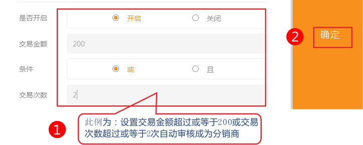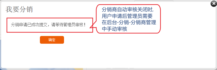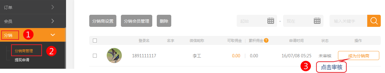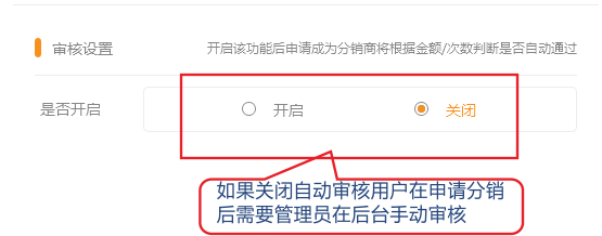 1.如果关闭自动审核功能,用户在申请后需在在分销商管理中手动审核。 1.依次点击分销-》分销商自动审核-》开启自动审核功能。 (注意:该申请会员的订单金额满足限制金额,且订单状态必须是交易完成(付款/发货/收货确认完成)
