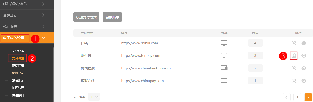 2、依次点击 电子商务设置-》支付设置-》财付通