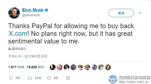 肥水不流外人田!极品域名X.COM又被Paypal前创始人买了回去西部数码(west.cn)7月11日消息,上周我们报道全球知名支付工具Paypal疑似出售了极品单字符域名X.COM。近日,外媒曝出,该域名原来又被Paypal的前创始人Elon Musk买了回去,这可真是肥水不流外人田呐!
