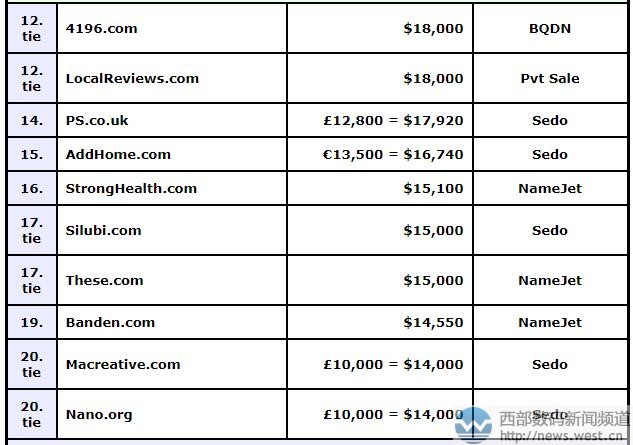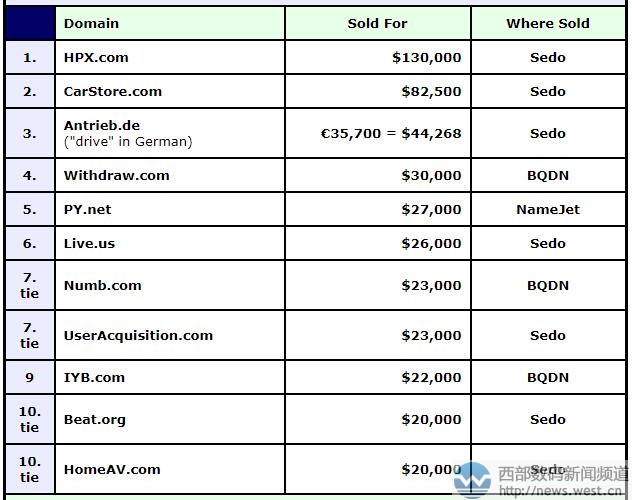 域名HPX.COM注册于1999年,对应有“惠普系、虎扑讯、红皮鞋、黑螃蟹”等诸多丰富的含义,适合用于鞋业、美食、资讯等网站平台。据外媒报道,此次收购域名HPX.COM的是一家加密货币服务商Hypex,官网域名为Hypex.io。小编猜测,Hypex公司下一步可能就是升级品牌域名了,毕竟HPX.COM比Hypex.io更简洁大气,也更易于推广和宣传。 排名第二的域名是carstore.com,成交价为82,500美元,约合人民币52万元。这也是前一期sedo榜的周冠军。该域名主体由单词“car”(汽车)和“store”(商店)组合而成,很适合搭建汽车电商,应用价值不俗。目前对应有台湾汽车百货(carstore.com.tw)。 接着是以44,268美元成交的德国域名Antrieb.de,约合人民币28万元。“Antrieb”是一德语单词,相当于英文中的“drive”(驾驶、驱动),在德国是含义清晰的常用词语,应用价值不错。 紧随其后的是通过BQDN成交的域名withdraw.com,成交价为30,000美元,约合人民币19万元。“withdraw”有“撤销、退出、取(钱)”的意思,是比较通用的英文动词。因此域名withdraw.com对于国外用户而言,记忆和输写优势都不错,适合多个领域建站使用。 接下来,两字母域名py.net以27,000美元结拍。作为两声母域名,py.net对应有“朋友、便宜、评优、配乐、批阅、聘用”等诸多词语,适合搭建招聘网、社交平台以及折扣电商网站等,可应用的空间较大。 除此以外,美国域名live.us以26,000成交,该域名对应使用频率很高的英文单词,具有“居住”的意思。英文域名numb.com和userAcquisition.com均以23,000美元成交,前者有“麻木”之意,后者是“用户获取”的意思。 其他更多域名交易情况,详见下表: