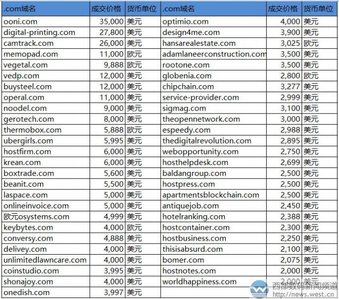 .com域名方面,四字母域名ooni.com以35000美元结拍,约合人民币22万元。该域名字符简短,品相上属于AABC型域名,比较好记好写,目前对应一款网络测量工具ooni probe。 随后是以27,800美元(近18万元)成交的扁担域名digital-printing.com,该域名虽然字符较长,但其“数位印刷”的含义却十分通用。数位印刷是一种以电脑处理为主的印刷,在市场上有着不错的影响力,以此命名的终端也颇多,因此与之对应的域名digital-printing.com应用价值也就不菲。 另外,英文组合域名camtrack.com以26,000美元成交,约合人民币16万元,具有“红外跟踪”,适合搭建旅游、健身等平台;除此此外,“记事簿”memopad.com(1.1万欧元)、“植物的”vegetal.com(9888欧元)、vedp.com(1.2万美元)、buysteel.com(1.2万美元)、operal.com(1.1万美元)等不少域名也都结拍了。 来源新闻资讯:“超级商店”登顶Sedo榜!“印刷”类域名近18万元成交