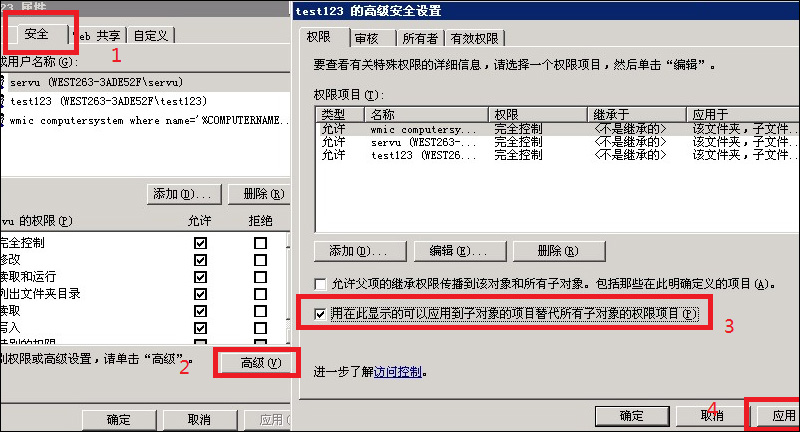 如果这些权限本身就存在,访问还是提示未授权,请右键站点目录属性安全高级勾选“用在此显示的可以应用到子项目替代所有子对象的权限项目”应用确认,如图:
