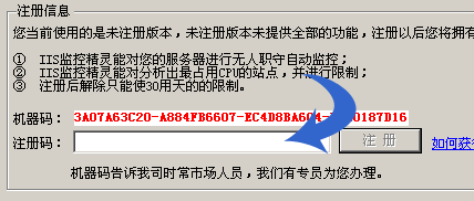 | 2). | 在注册码输入框(兰色箭头处)中输入我们发送给您的注册码 |